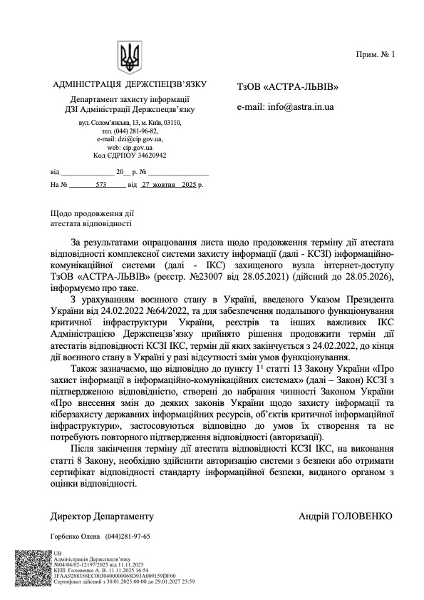 | Атестат відповідності ТзОВ Астра-Львів | |
